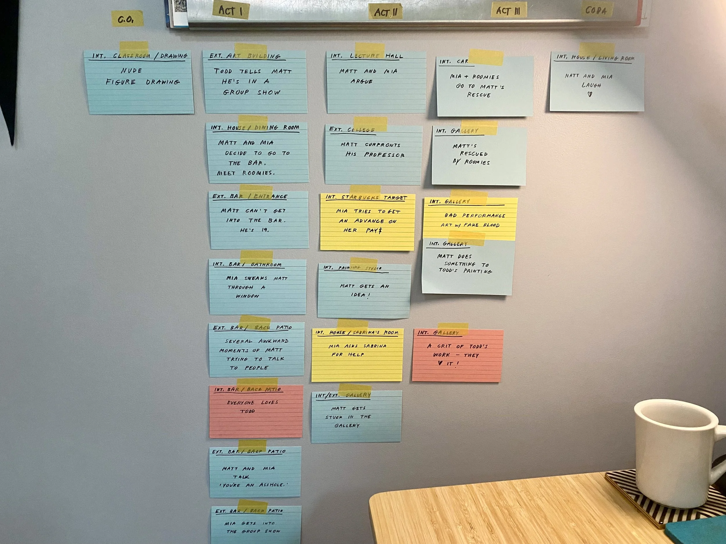 In five weeks I: created an elevator pitch for a comedy pilot, pitched it orally to a writing partner, got feedback, made character sheets, watched like-minded comedy pilots (Adults, Broad City, Alone Together) and broke them down scene by scene, told my pilot story out loud to a writing partner, got more feedback, made cards of scenes/beats, told the story from the cards, and turned the cards into an outline. I am currently writing my (vomit pass + 2 revision) draft, where the magic happens.