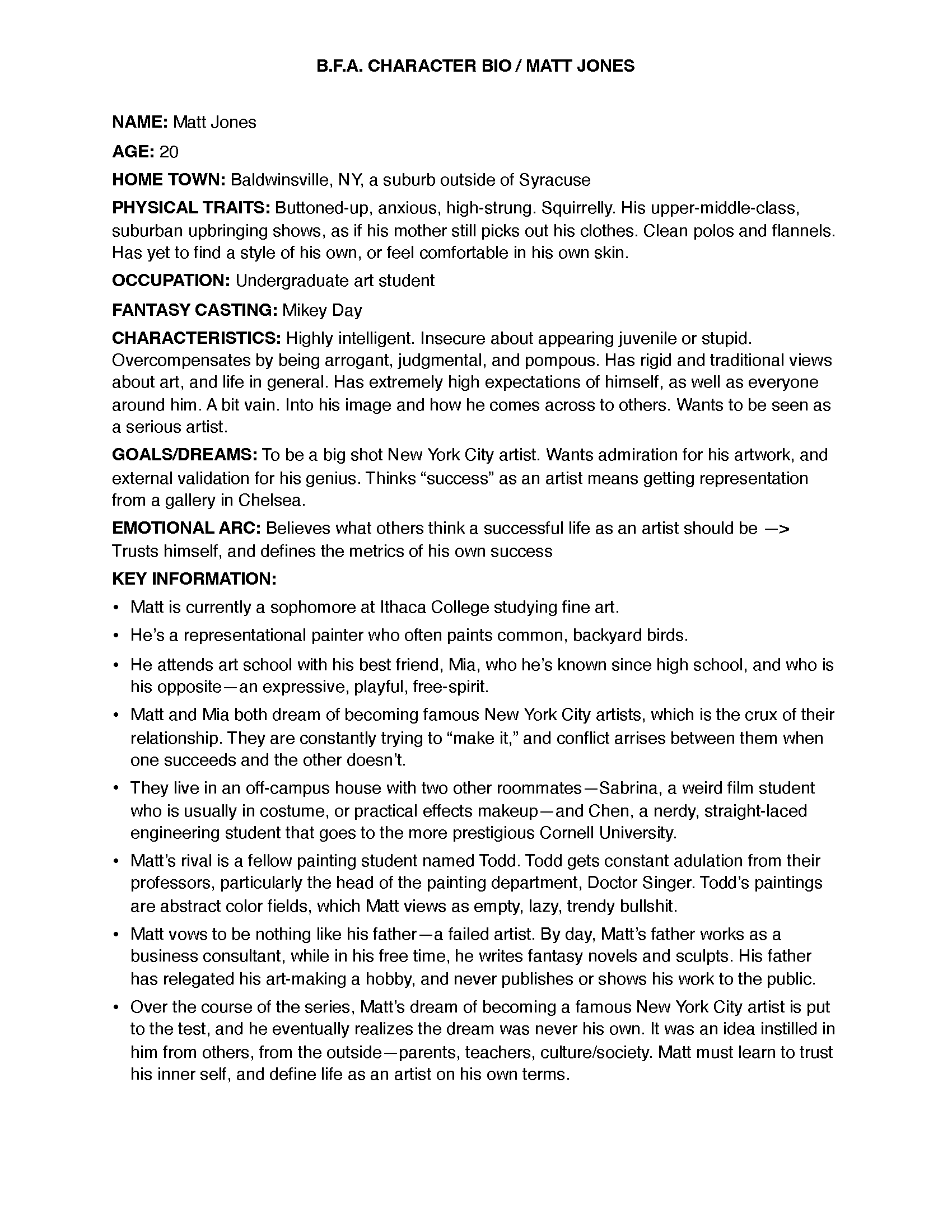 The cold open for a comedy pilot I wrote, B.F.A. It’s a coming-of-age story based on my own experiences in art school, and the struggles of being a young artist. It’s set in the rural college town of Ithaca, NY and follows Matt Jones, a 19-year old sophomore that takes himself and his art way too seriously. His best friend Mia is much more adventurous and free-spirited. They both dream of becoming big-shot NYC artists, which is the crux of their relationship—how they are constantly trying to “make it,” and the conflict when one of them succeeds and the other doesn’t.